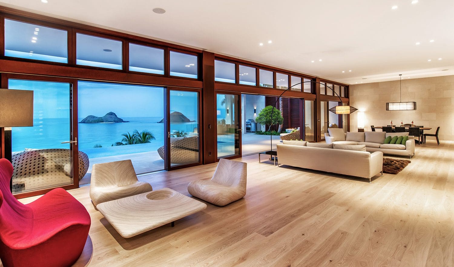 The open floor plan, white walls and ceiling, blonde plank-wood oak flooring, and dark mahogany wood trim is unimposing, naturally making the focal point the spectacular views of the ocean. The ambiance peaceful and serene.