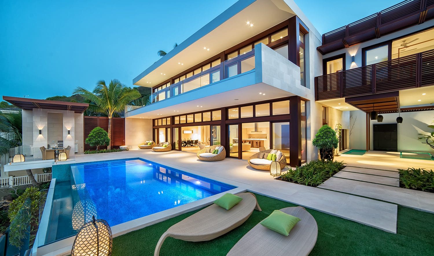 “Three lanais, an infinity-edge swimming pool with glass tiles custom made in Germany to match the natural turquoise waters and a hot tub located on a private sun deck complete with glass railings throughout for assured unobstructed views provide a natural indoor-outdoor flow while enlivening the space,” Allen adds. “Two gas fire pits with glass stones illuminate beautifully at night. The setting is perfect for entertaining or for easy-breezy solo downtime.”