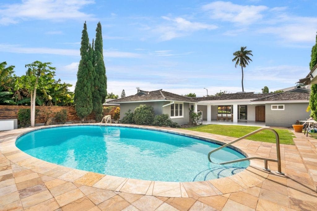 Located near Kahala Mall, the beach and Diamond Head, this four-bedroom, two and one-half bath residence offers a spacious lanai that’s ideal for gatherings, stainless steel kitchen appliances, an open floor plan of approximately 2,416 square feet of living space and a pool.