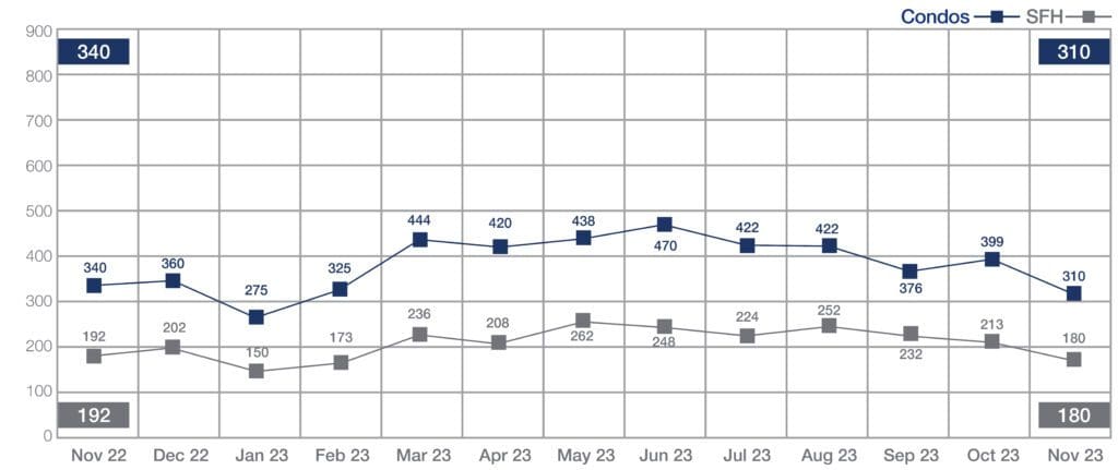 Comparing November to November 2023 however, the numbers are a bit more encouraging. The number of single-family homes that closed in November was 180 compared to 192 a year ago. Condo closings last month totaled 310, compared to 340 a year ago.