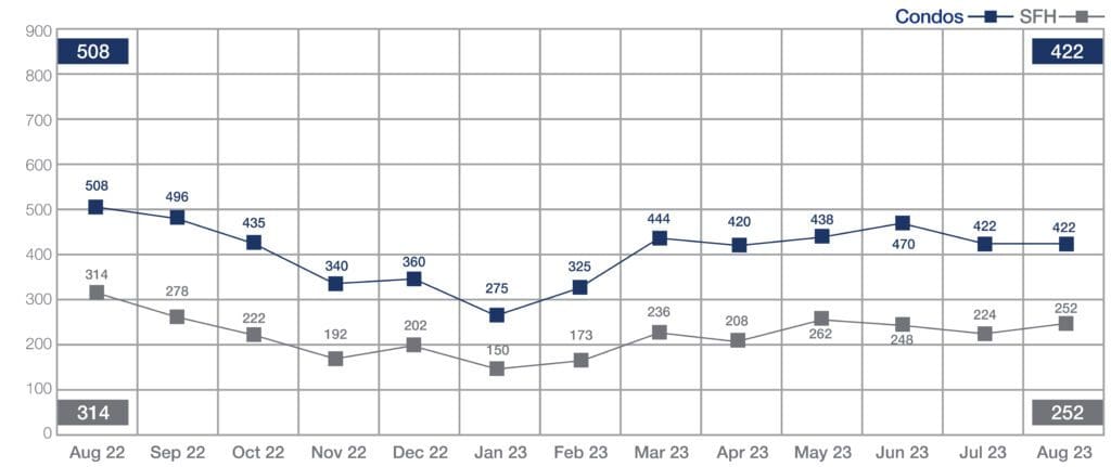 SF homes in the $900,000 to $1,199,999 price range experienced the most sizable decrease in sales activity — down 32% from a year ago, possibly due to homebuyers reducing their target price to accommodate the higher mortgage rates. Indeed, in the SF price range between $600,000 and $899,999, there was a 13.1% increase in sales from last August.