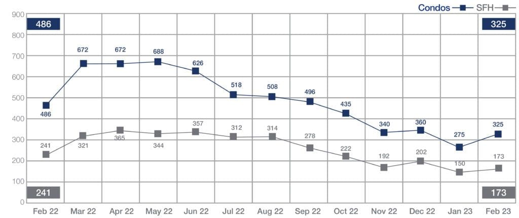 The median price of a single-family home in February is down 12.3% — from $1,125,000 in February 2022 to $987,000 last month. As noted, the impact of 62 fewer homes in the $1 million-and-up category that sold in February — from 147 million-dollar homes that sold in February 2022 to 85 last month — is significant and most certainly took a bite out of the overall MSP figure.