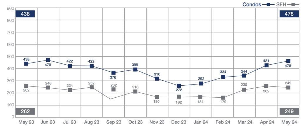 To complement the increase in demand, supply (inventory) in both the SF and condo segments reported double-digit increases somewhat easing the crunch in available listings. New single-family listings were up 11.7% from May 2023, bringing the number of active listings up 17.9% from last year. New condo listings were up 13.1% from a year ago, bringing the current active inventory of condos up 47.7% from last year, and offering buyers more choices and more opportunities.