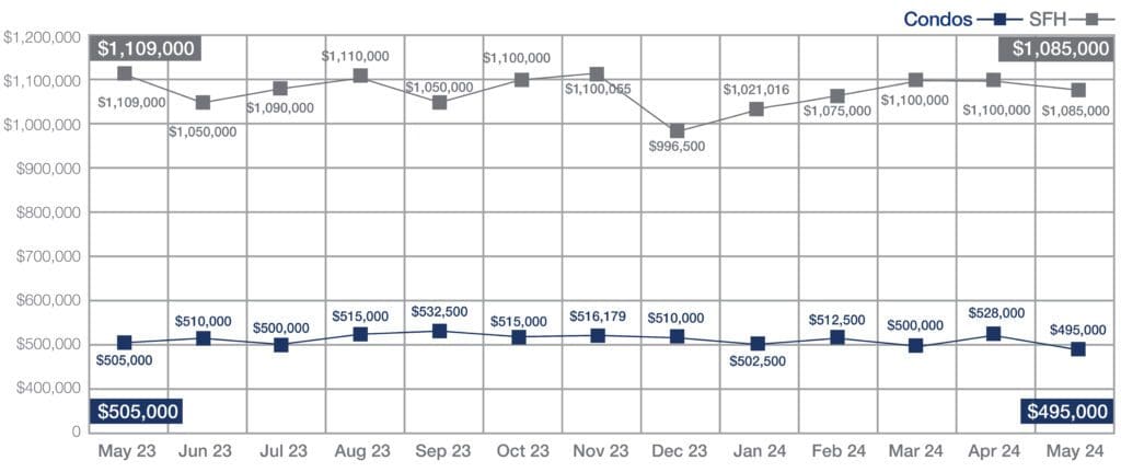 In May, single-family homes sold for a median sales price of $1,085,000, down slightly from $1,109,000 in May 2023.