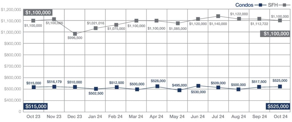 In October, the median price of a single-family home held at $1,100,000, neck and neck with the MSP in October 2023.