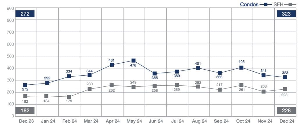 By year-end, single-family home sales volume increased by 9.1% (2,793 homes sold) and condo sales decreased 2.5% (4,459 condos sold) from 2023 sales.