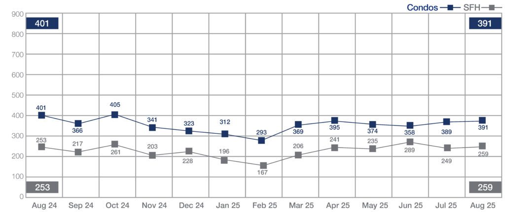 Condominium sales dipped 2.5% year-over-year—from 401 units in August 2024 to 391 this year. Year-to-date condo sales are down 4.7%, with 2,881 units sold compared to 3,024 in the same period last year.