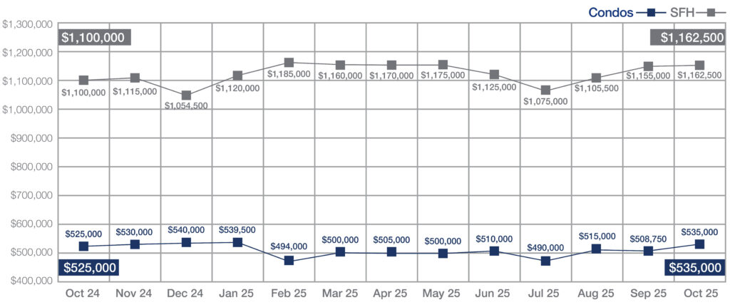 The median sales price for single-family homes climbed 5.7% year-over-year to $1,162,500, while the year-to-date median stands at $1,150,000—up 4.5% from the same period in 2024. Condominium prices posted a modest gain, with October’s median at $535,000, a 1.9% increase from last year. Year-to-date, the condo median remains steady at $510,000.