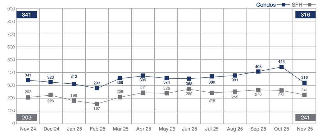The median sales price for single-family homes dipped 1.3% year-over-year to $1,100,000, while the year-to-date median rose 3.8% to $1,141,500. Condominium prices fell more sharply, with November’s median at $487,450—an 8% decline from last year. Year-to-date, the condo median eased 0.4% to $507,750.