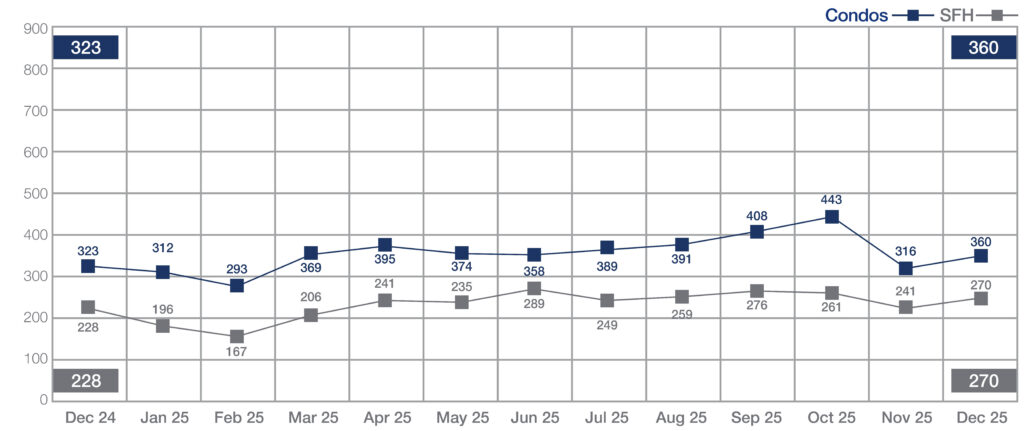 Single-family home sales climbed to 270 transactions, an 18.4% increase from 228 in December 2024, while condominium sales rose 11.5% to 360 units, up from 323 last year. Pending sales activity was mixed, with single-family improving by 3.1%, while condos declined 9% compared to the same period last year.
