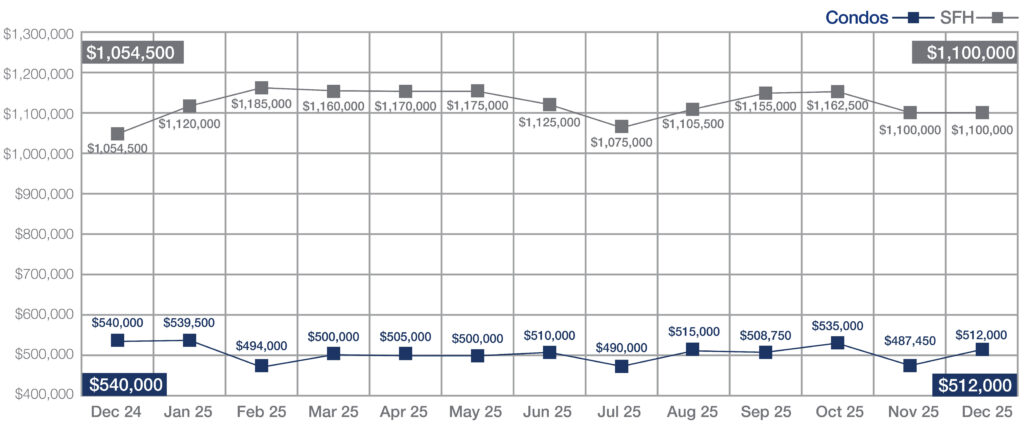 The median sales price for single-family homes held steady at $1,100,000, marking a 4.3% year-over-year increase. Condominiums posted a median price of $512,000, down 5.2% from December 2024’s record high. Year-to-date, the single-family median rose 3.5% to $1,139,000, while the condo median eased 1.5% to $507,250.